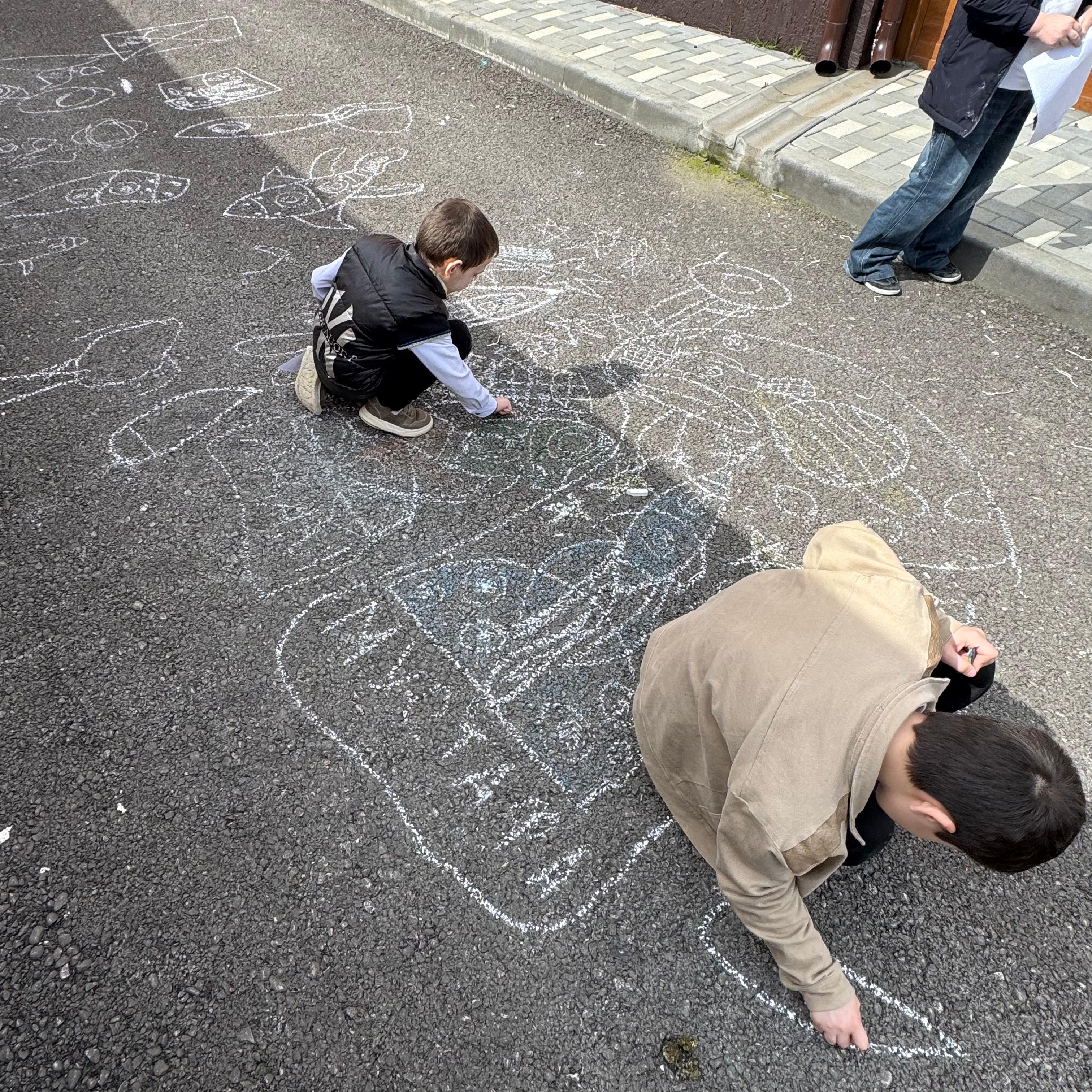 Ребята с большим увлечением играли цветными мелками, и вскоре асфальт на территории гимназии покрылся яркими рисунками. В них дети изображали ракету, небо со звездами, нарисовали космонавта. Детское творчество в технике коллективного рисунка мелом на асфальте позволяет не только проявить творческие способности, но зарядиться хорошим настроением и радостью от собственных «шедевров». С днем космонавтики!